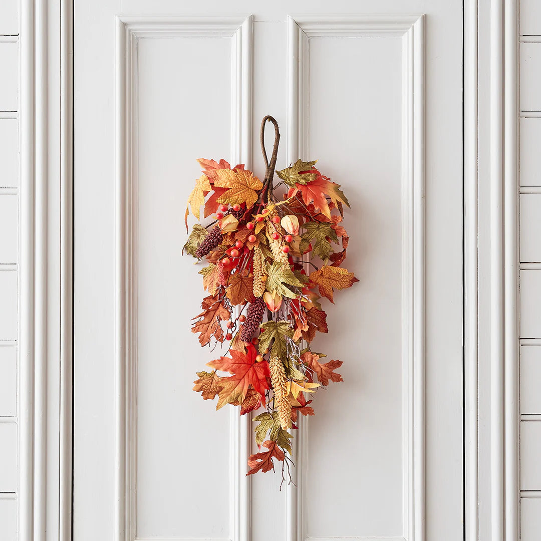 Our elegant autumn swag has been delicately handcrafted in colours of the autumn season. Transform doors in your home, creating an inviting and cosy autumn space filled with vibrant colours. Made from faux foliage and artificial berries in orange, red and green, you can display all season long and for years to come. At a height of 70cm, it will make a lovely addition to the back of chairs for autumn dinner parties with friends and family. The hanging loop allows for easy display on walls inside your home, perfect for adding autumnal finishing touches.