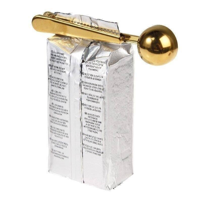 Gold-coloured stainless steel coffee scoop with a 2 in 1 design.