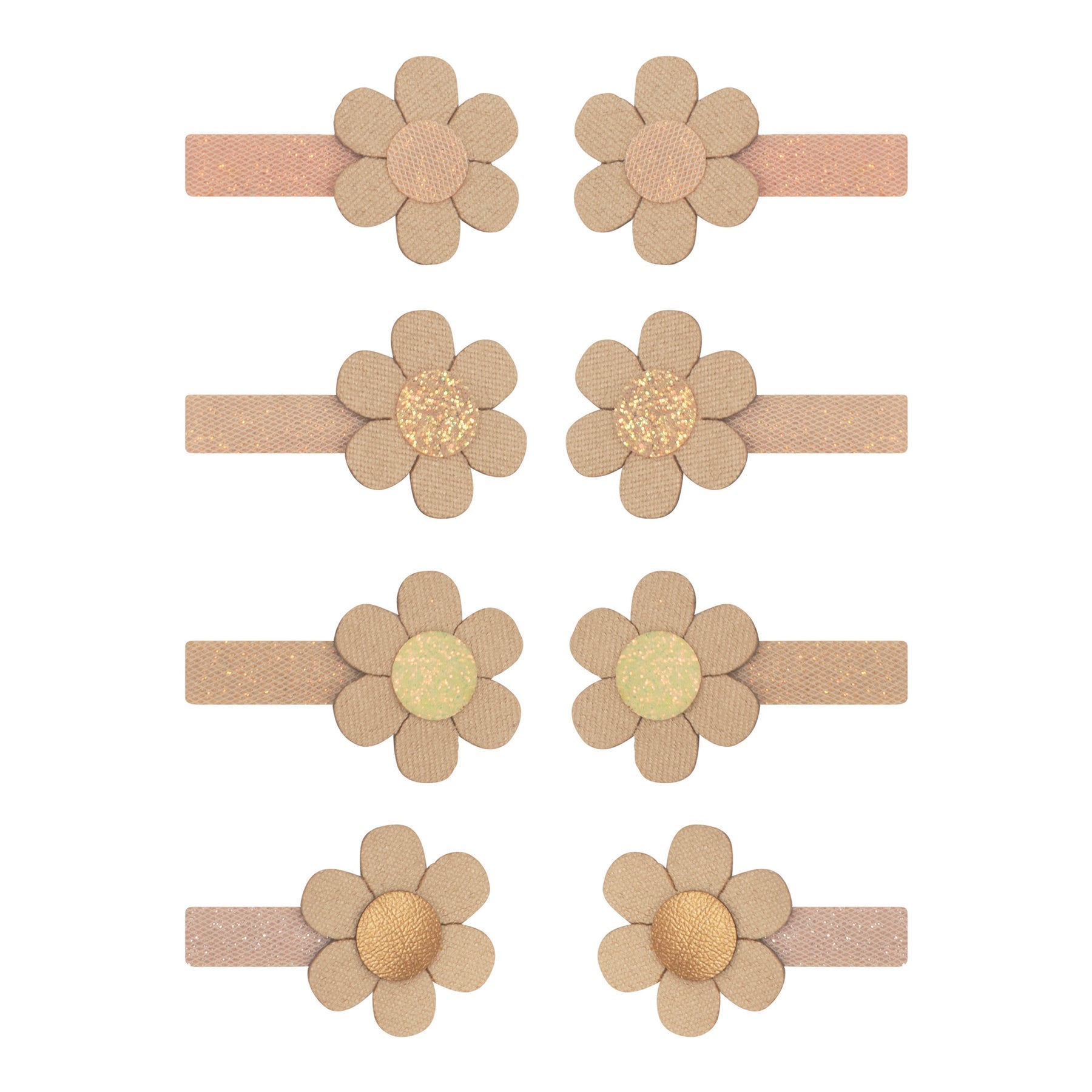 - Sparkling fabric wrapped 3cm alligator clips adorned with sweet fabric daisies with a combination of metallic and glitter centres