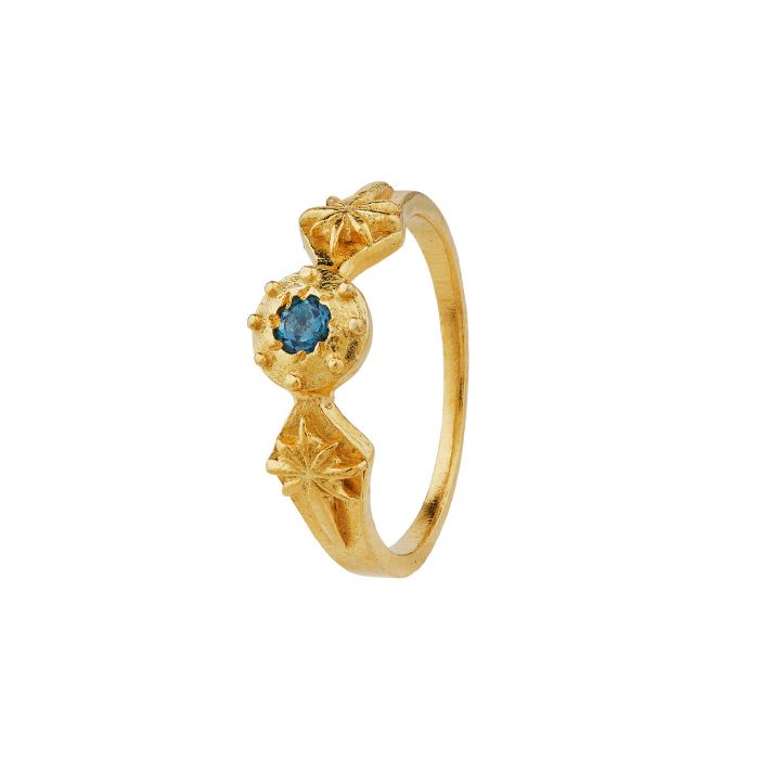 A rich and sparkling blue topaz shines from the centre of this radiant ring, framed with stars