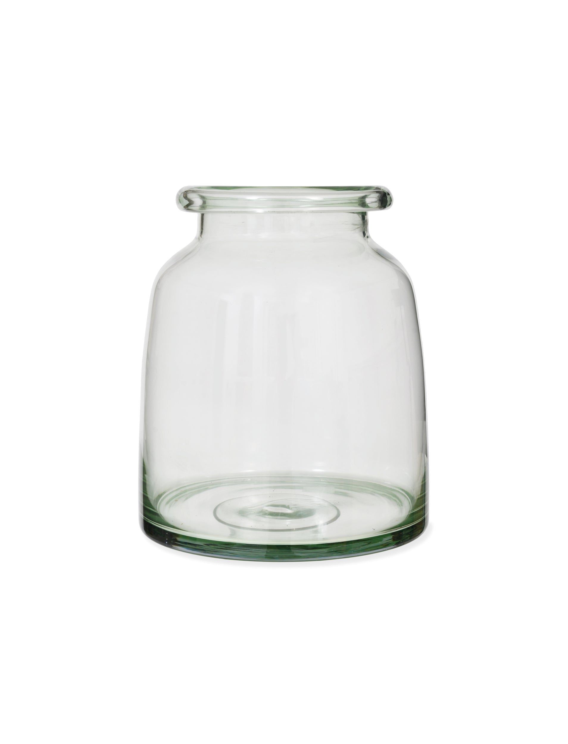 Inspired by vintage pickle jars, the Mickleton Vase is hand-blown from recycled glass with a distinctive chunky rolled rim and wide base. This makes it perfect for use with medium sized bouquets or a handful of beautiful big blooms like peonies, hydrangea and dahlias.