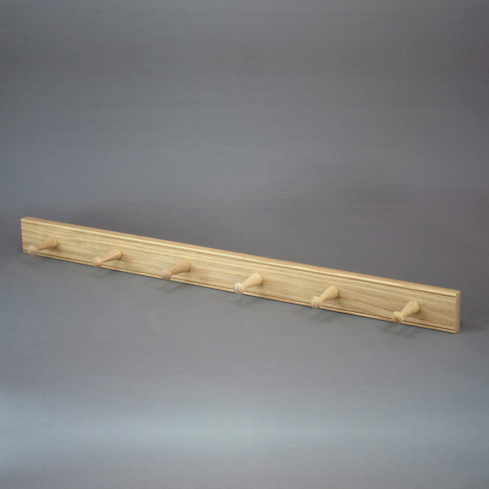 A beautifully crafted oak peg rail perfect for coats and jackets, hats and scarves, or storage of any household essentials. 6 pegs on a solid piece of natural oak with a beaded detail top and bottom and concealed keyhole fixings at the rear.