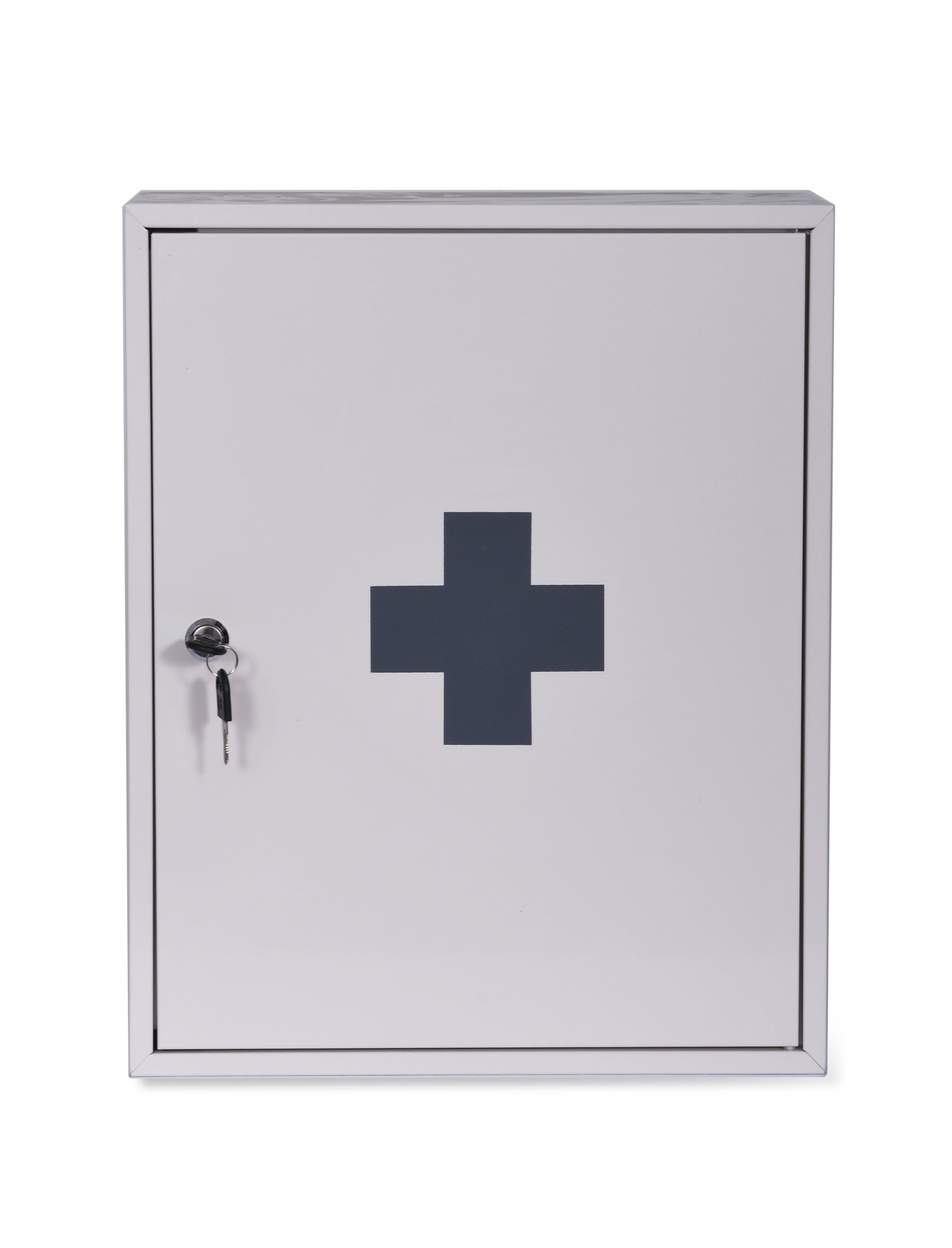 The unit is crafted from Powder Coated Steel and finished in our neutral Chalk colourway with a bold Charcoal cross. Inside sit three shelves for arranging all items for the odd accident or illness. The door has a secure lock and is supplied with 2 keys, keeping the contents safe and out of reach of children.