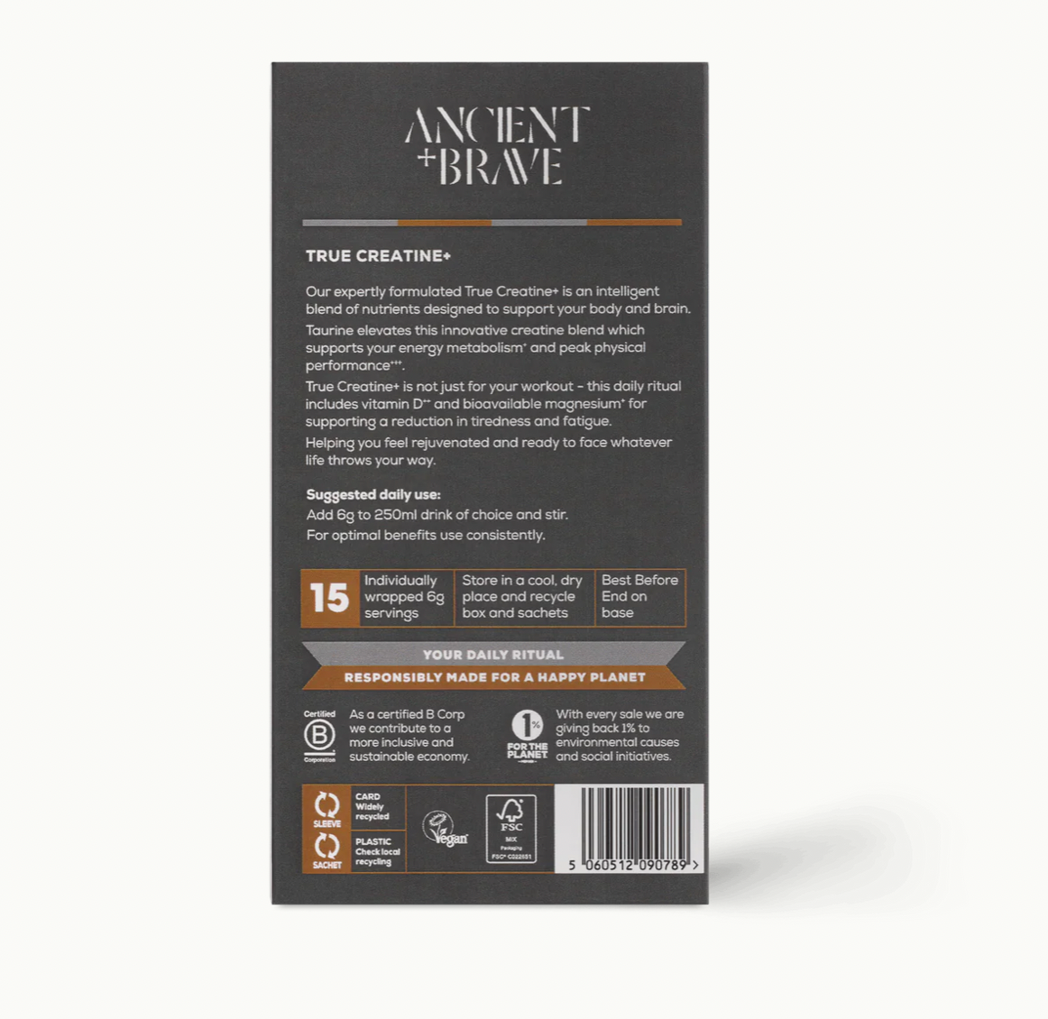 This daily ritual, enriched with vitamin D and bioavailable magnesium to combat tiredness and fatigue, prepares you for anything life throws your way. Our True Creatine+ powder is neutral tasting, perfect for you to add to water or a drink of your choice. For optimal benefits, we recommend using it daily and consistently.